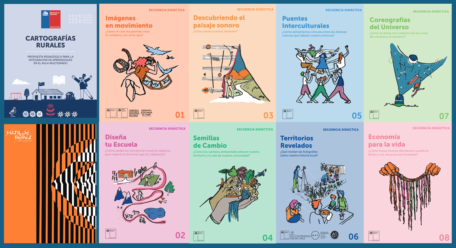 Esta propuesta para el trabajo pedagógico comenzó en 2024 con los materiales didácticos “Cartografías Rurales” y “Matilde Pérez: Configuración”. Tras su positiva recepción en comunidades educativas rurales de todo Chile, se diseñó una colección de 8 paquetes adicionales. Cada uno de ellos propone la implementación de un proyecto de aprendizaje integrado que articula diversas asignaturas en torno a una pregunta movilizadora, un propósito formativo, un elemento integrador y un producto final compartido con la comunidad. Su diseño flexible permite su adaptación a distintas realidades locales, promoviendo la valoración de saberes territoriales, prácticas culturales y de los asuntos ambientales propios de cada contexto rural.